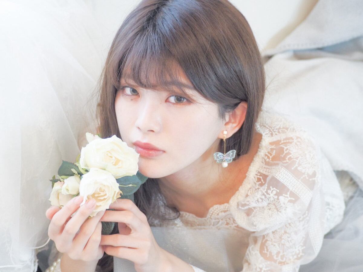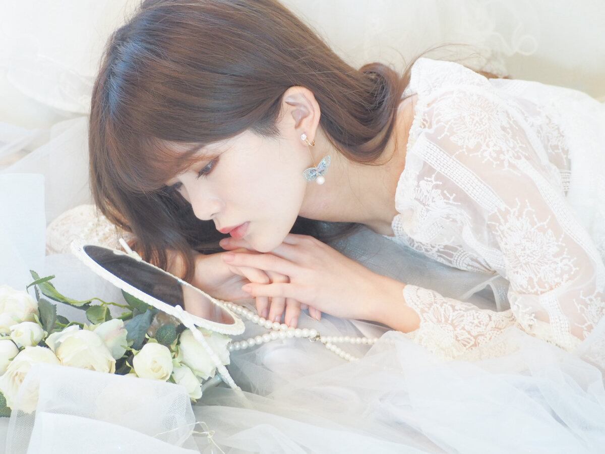 繊細な刺繍でできた蝶にコットンパールをあしらいました。