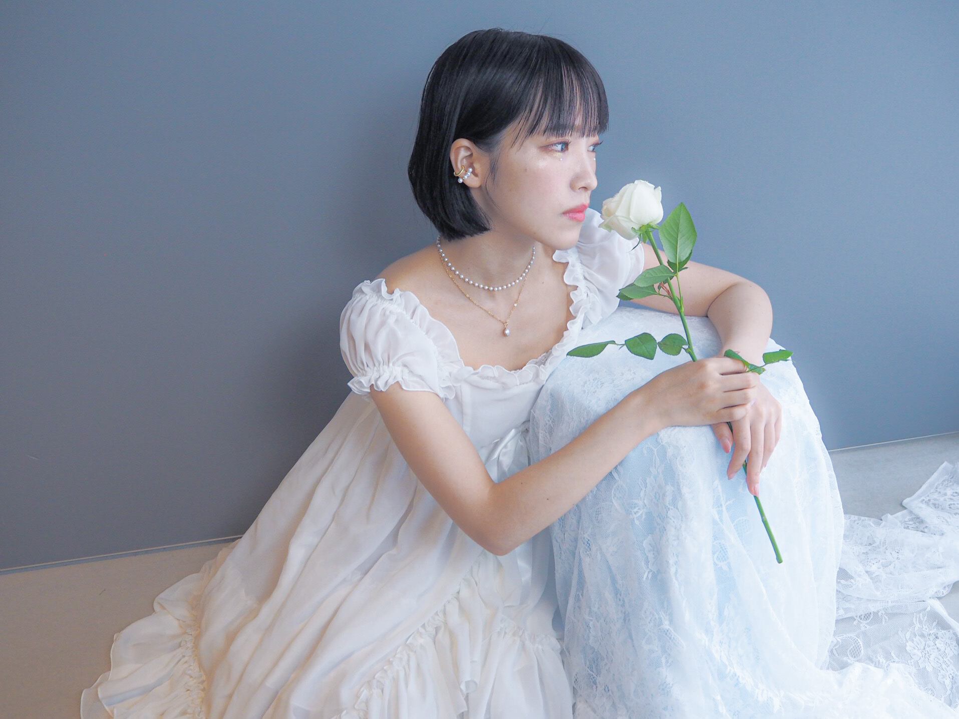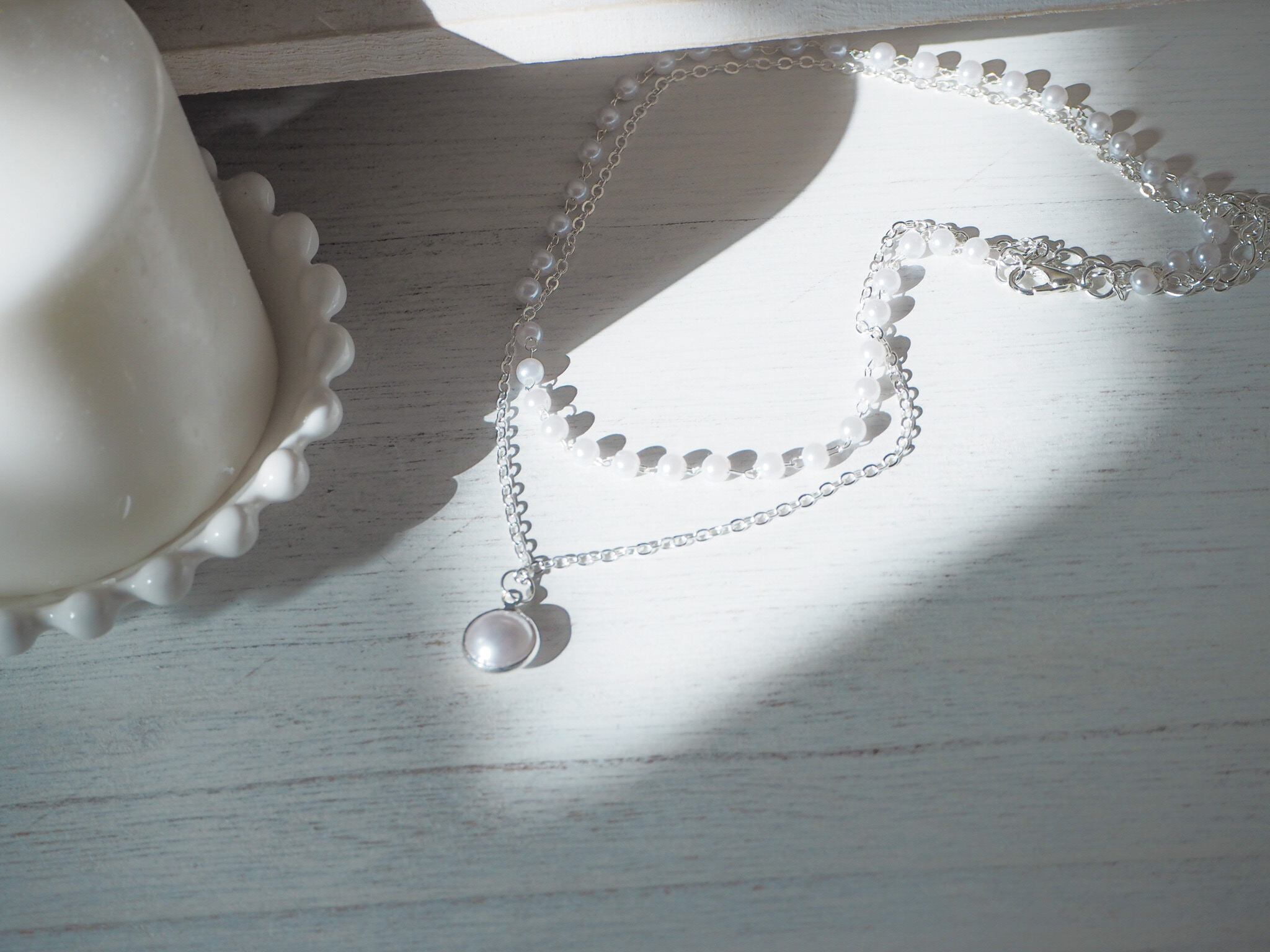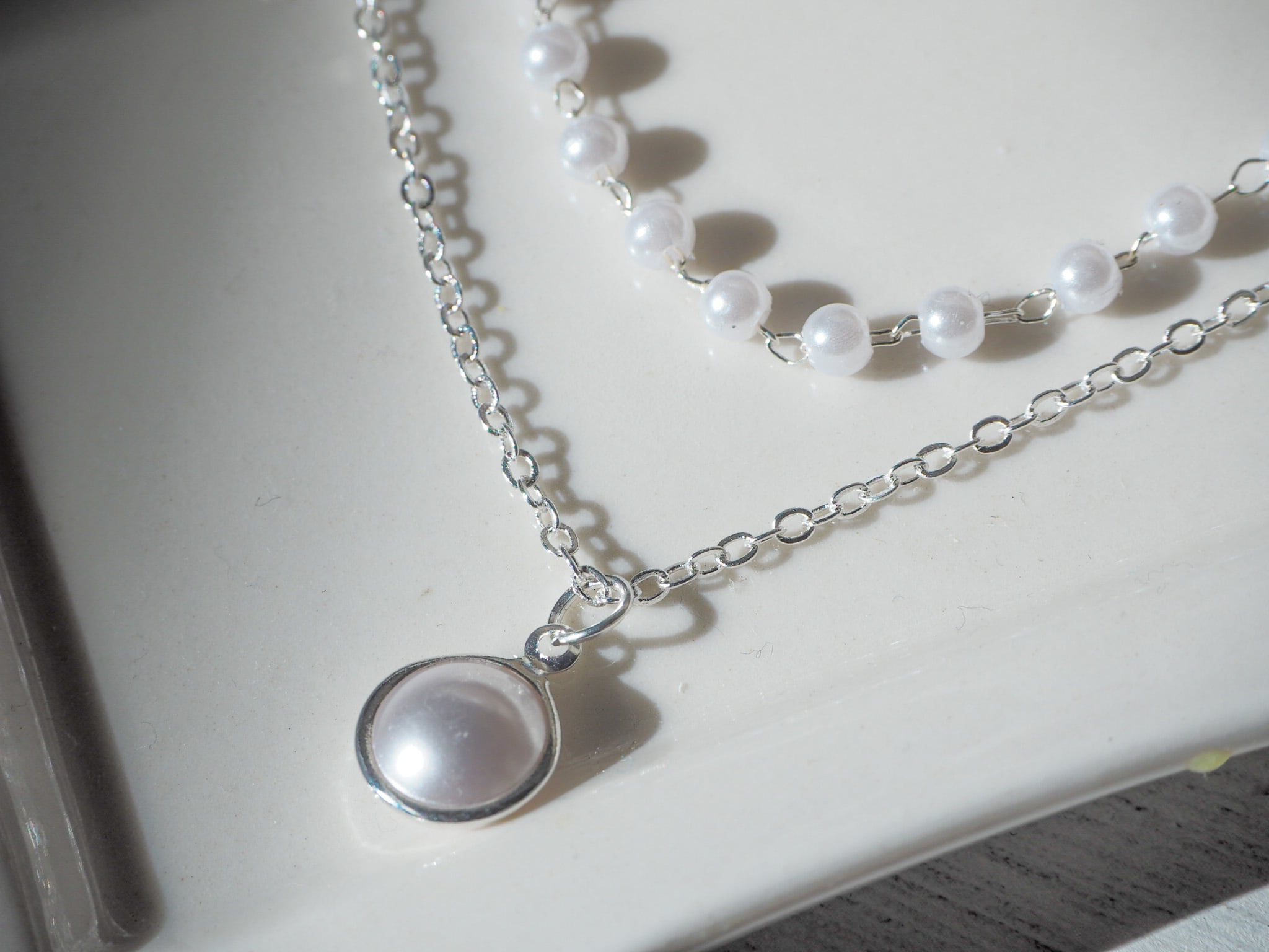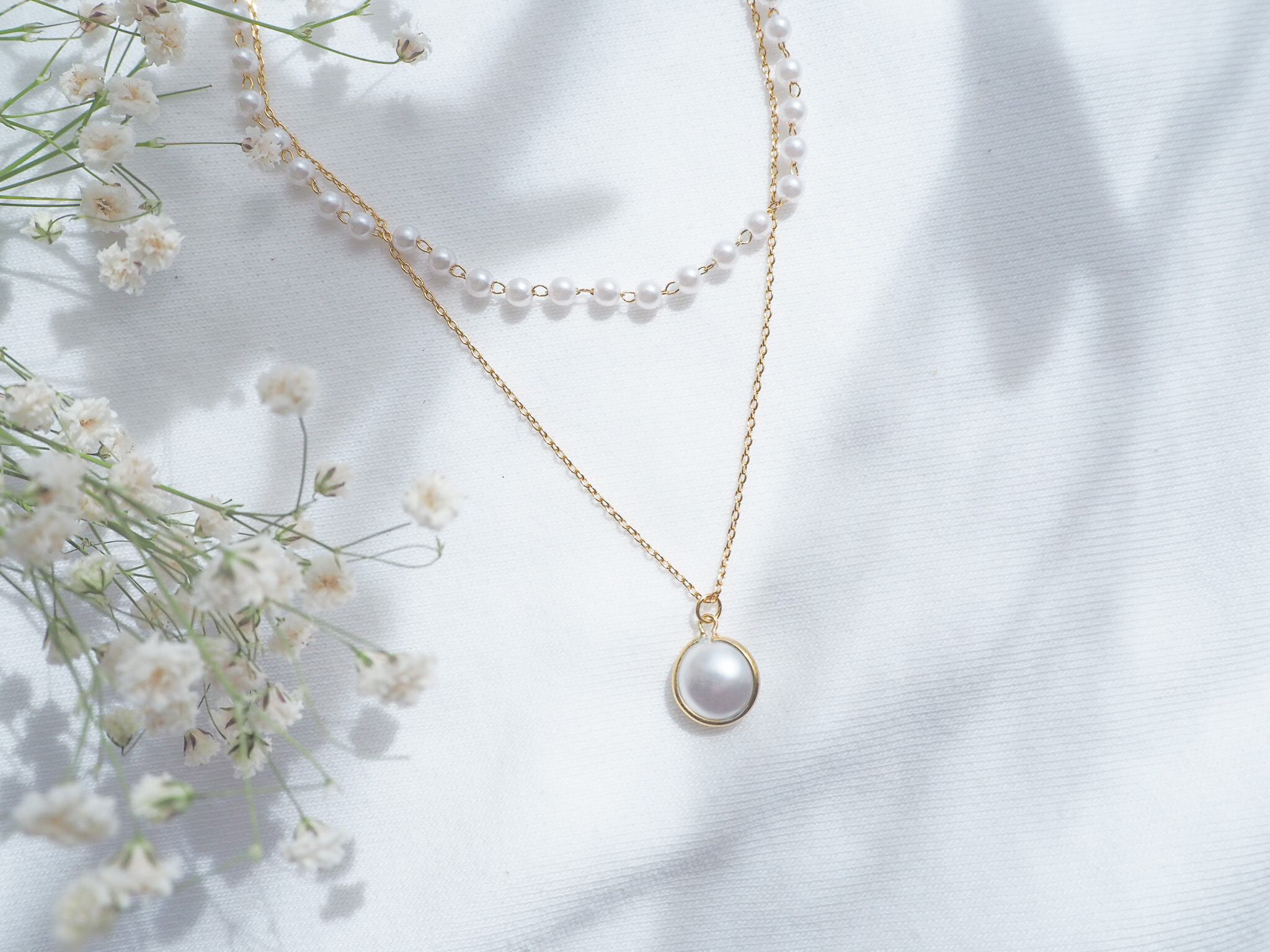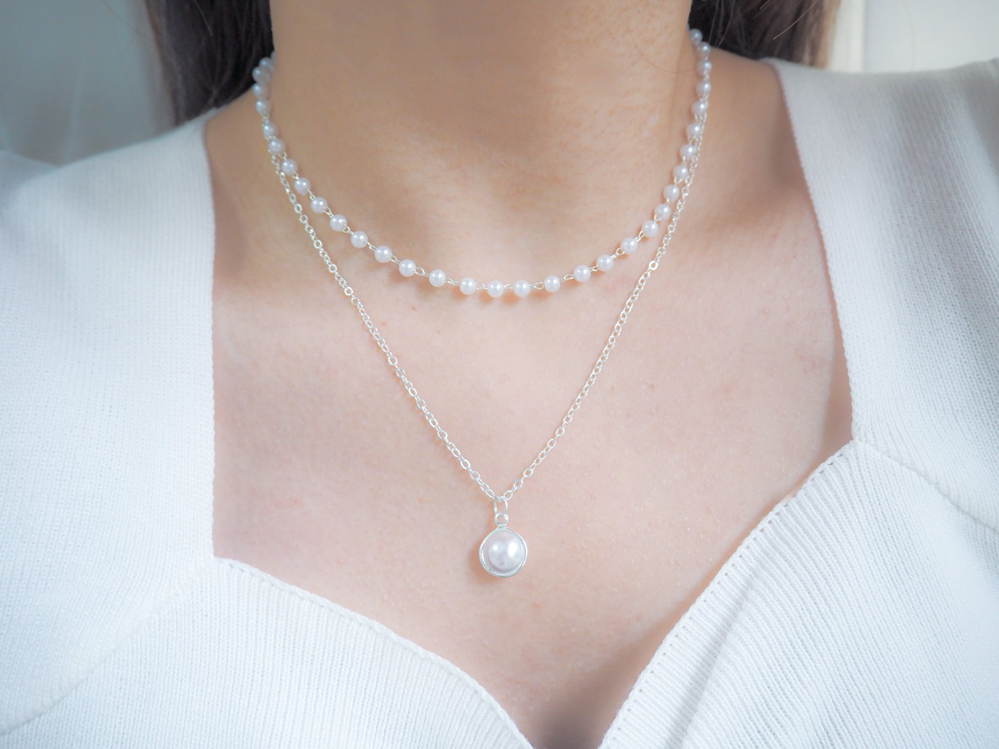 2連のため華やかで、U字とV字のネックレスの重なりが首元をすっきりと美しく見せてくれます。