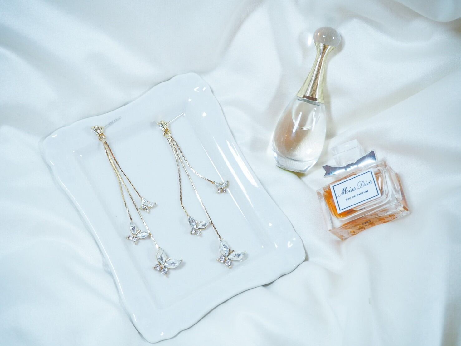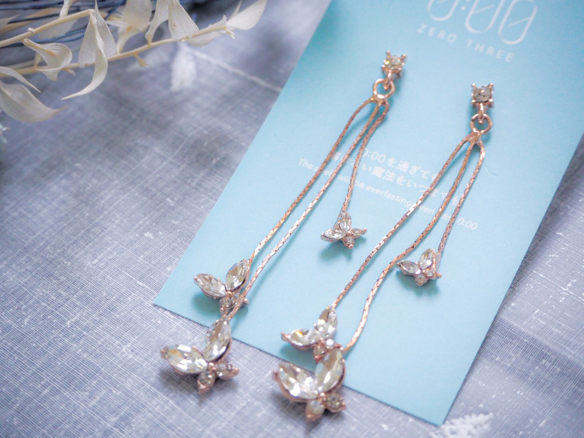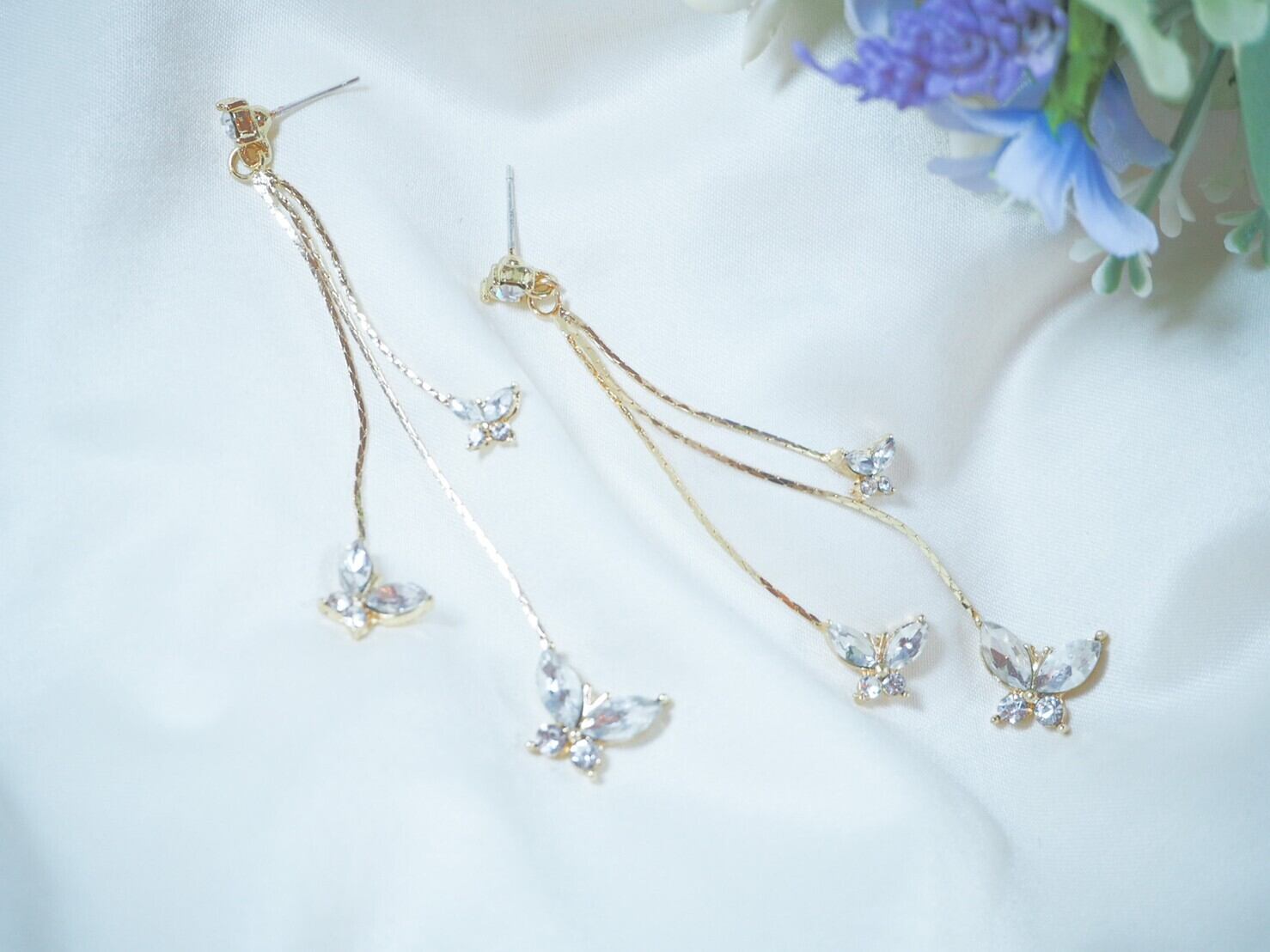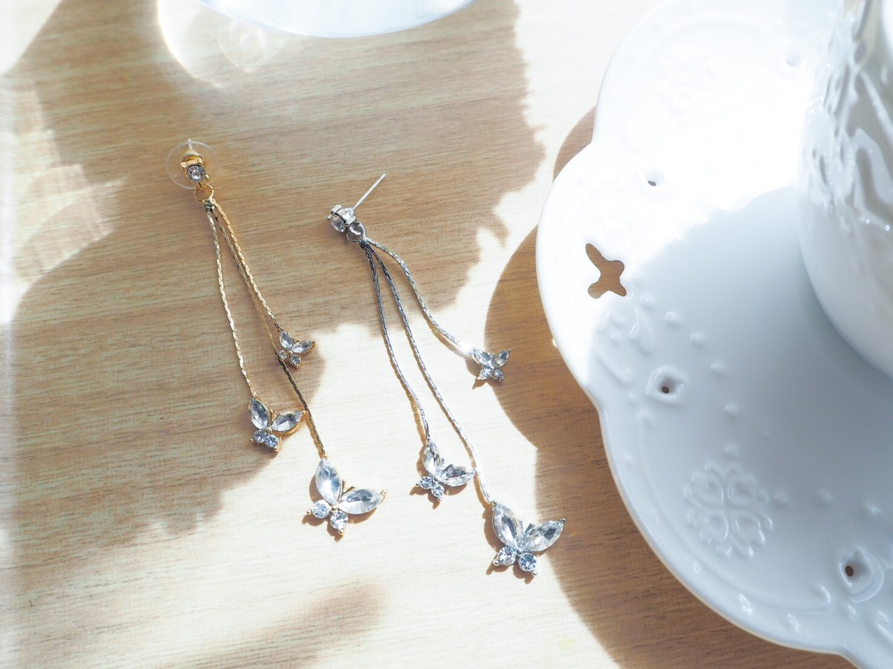 サイズの異なるビジューの蝶をチェーンでつなげたイヤーアクセサリーです。