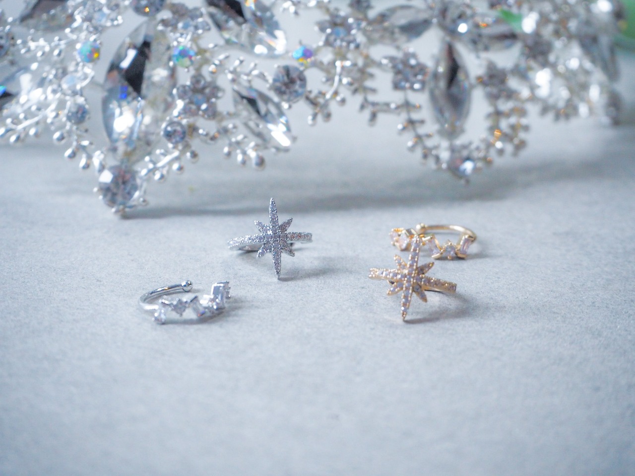 星デザインのイヤーカフは、耳にかける部分までビジューで飾られておりどこから見てもキラキラに輝いています。クリスタルのイヤーカフは小さいながら様々な形が並ぶ様が上品な仕上がりとなっています。